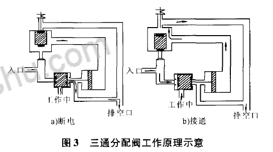工作原理:当通电时,动铁心吸合,关闭先导孔,气体推动滑块运动,使工作口与入口想通;当断电时,先导孔打开,气体推动滑块运动,工作口与排空口相通,实现气体分配的功能。该阀还可以手动应急操作。原理见图3.