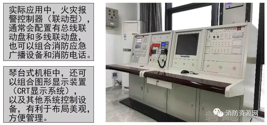 4、实际应用中,火灾报警控制器(联动型),通常会配置有总线联动盘和多线联动盘,也可以组合消防应急广播设备和消防电话、组合图形显示装置(CRT显示系统)。在较大规模的系统中,较广泛的应用是琴台式机柜,布局美观,方便管理。