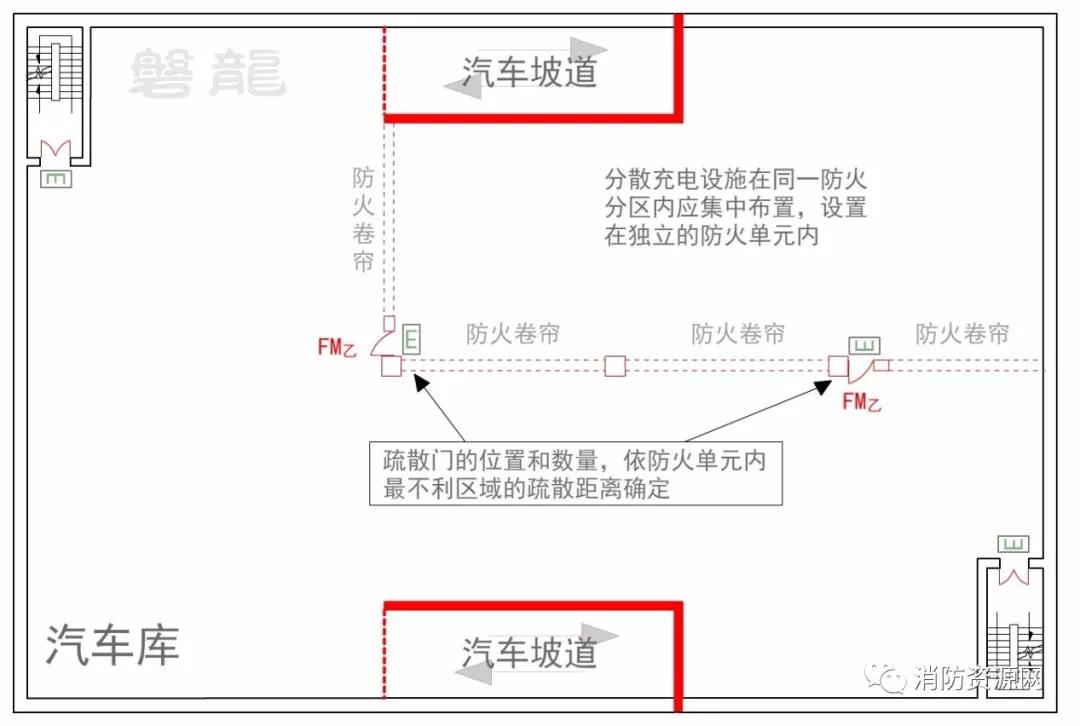 设置有分散充电设施的汽车库,需要划分为一定面积的防火单元,根据“疏散距离应为行走直线距离”的基本原则,势必增加安全出口。