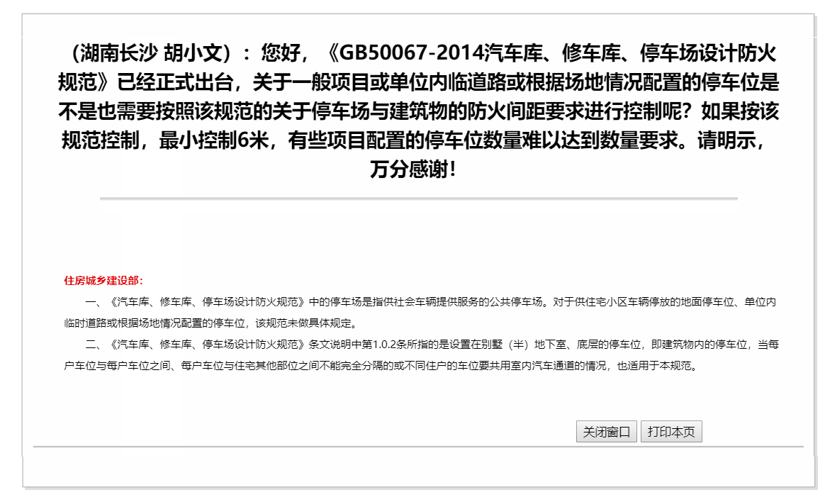 关于住宅小区及单位停车位是否适应于《汽车库、修车库、停车场设计防火规范》的问题,根据《住房城乡建设部》的答复:“《汽车库、修车库、停车场设计防火规范》中的停车场是指供社会车辆提供服务的公共停车场。对于供住宅小区车辆停放的地面停车位、单位内临时道路或根据场地情况配置的停车位,该规范未做具体规定。”